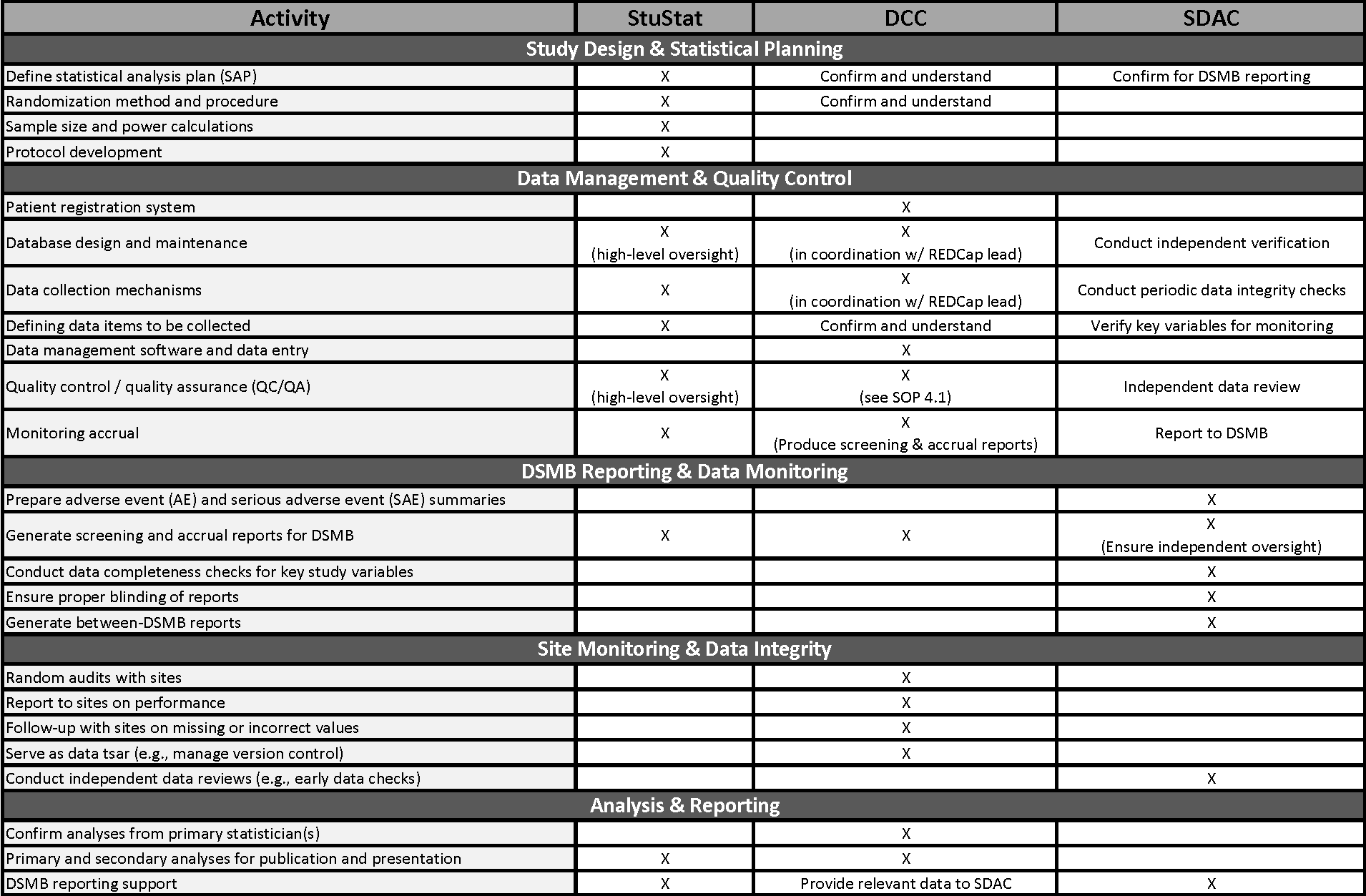 The statistical team collaborates across multiple functions, with the StuStat primarily responsible for study design and analysis, the DCC for data management and quality control, and the SDAC for independent data monitoring and DSMB reporting: